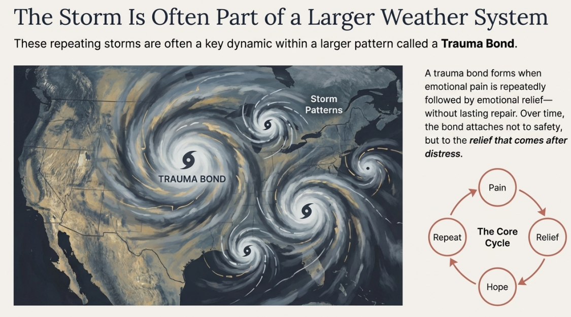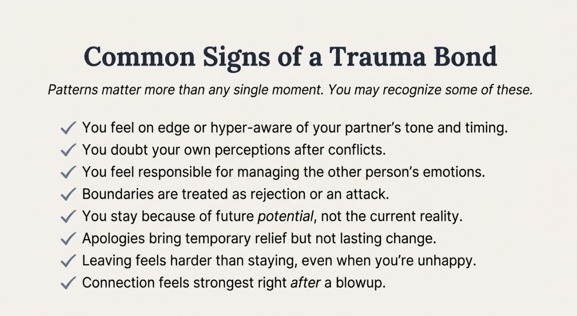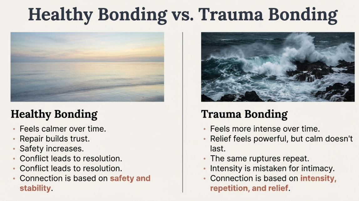 A trauma bond forms when emotional pain is repeatedly followed by emotional relief — without lasting repair.